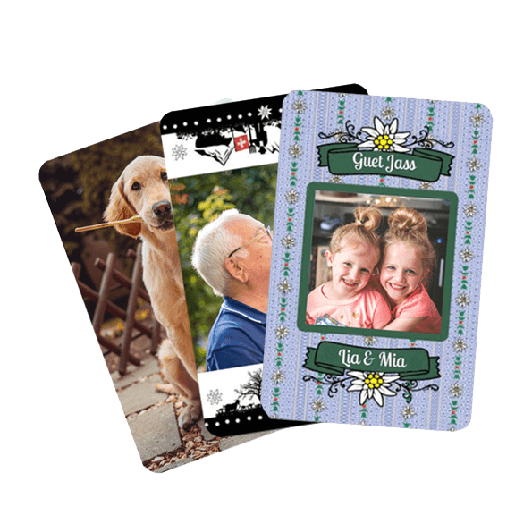 Personalisierte Jasskarten (oder Pokerkarten, Rommékarten, Yunokarten) mit eigenem Firmen- oder Vereinslogo sind ein ideales Werbegeschenk oder Give-away für Kunden oder Vereinskollegen. Jasskarten sind in der Schweiz äusserst beliebt und werden lange benutzt. So bleibt Ihre Werbebotschaft über einen längeren Zeitraum bestens in Erinnerung. Bei Jasswelt.ch erhalten Sie professionelle Beratung und kreative Vorschläge für Ihre individuellen Spielkarten mit eigener Rückseite.